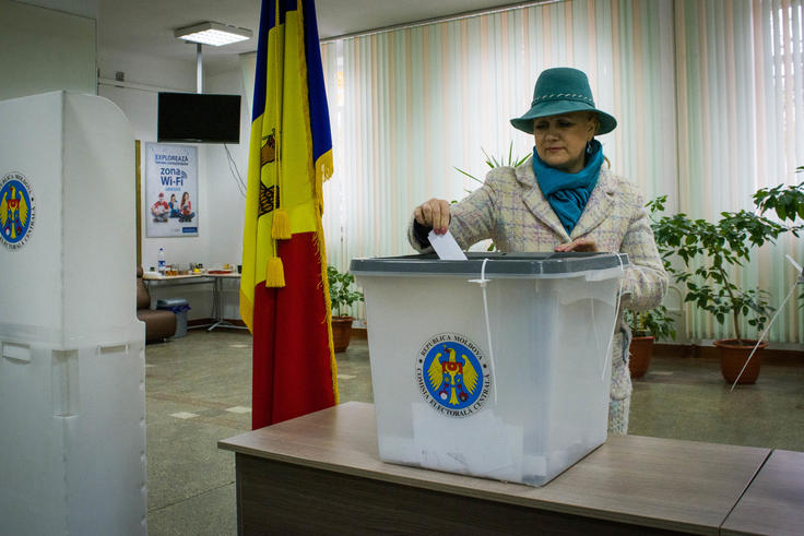 A voter casting her ballot at a polling station in Chisinau during the second round of Moldova's presidential election, 13 November 2016.