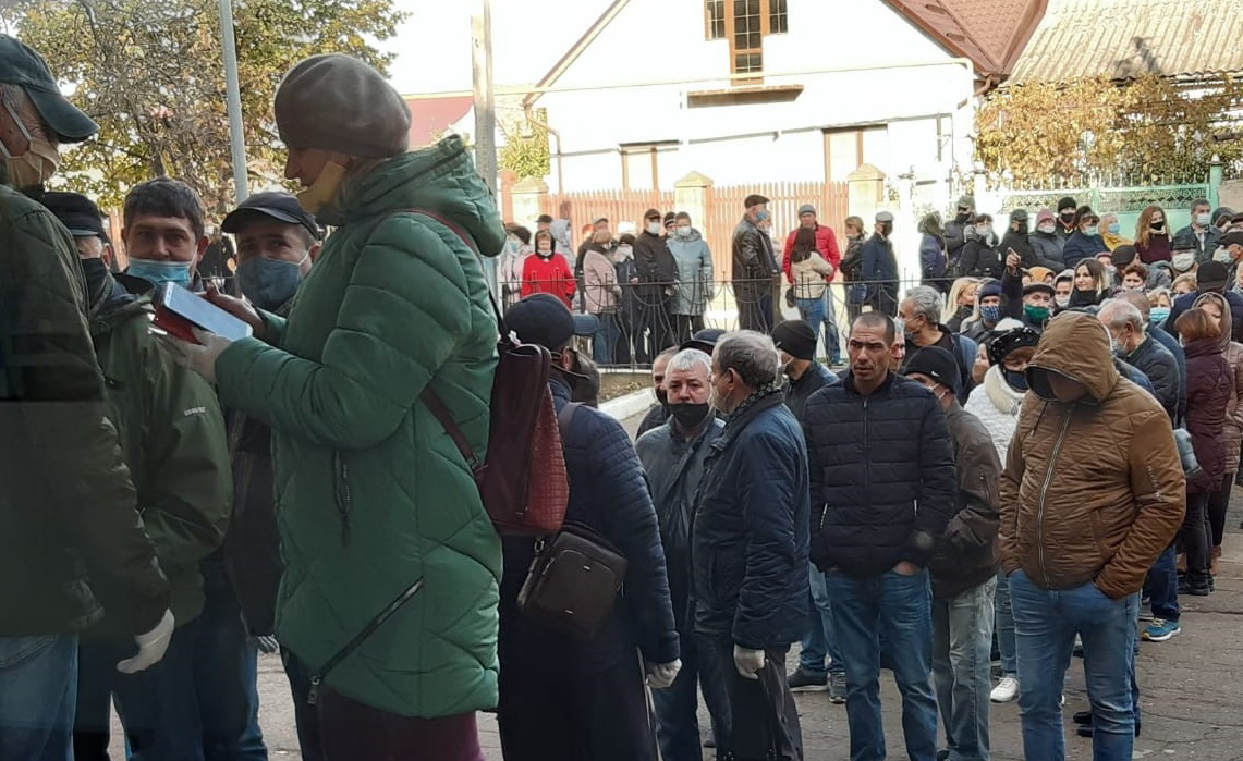 Voters stand in queue in the village of Varnita to cast their ballots during the second round of Moldova’s presidential election. 15 November 2020