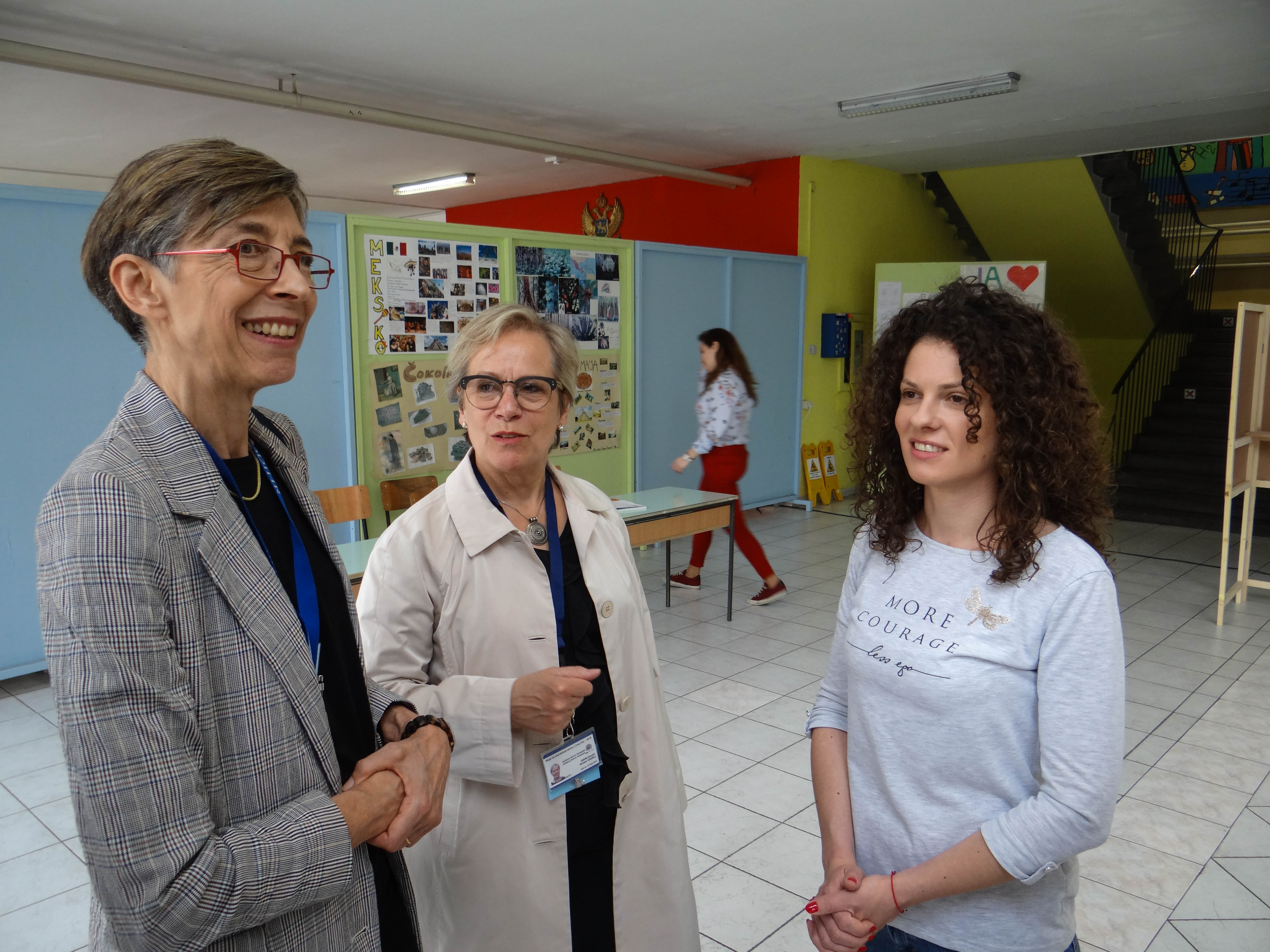 Tana de Zulueta (l), head of the ODIHR election observation mission for the presidential elections in Montenegro, and ODIHR Director Ingibjörg Sólrún Gísladóttir (c) speaking with the deputy head of a polling station commission in Podgorica, 15 April 2018.