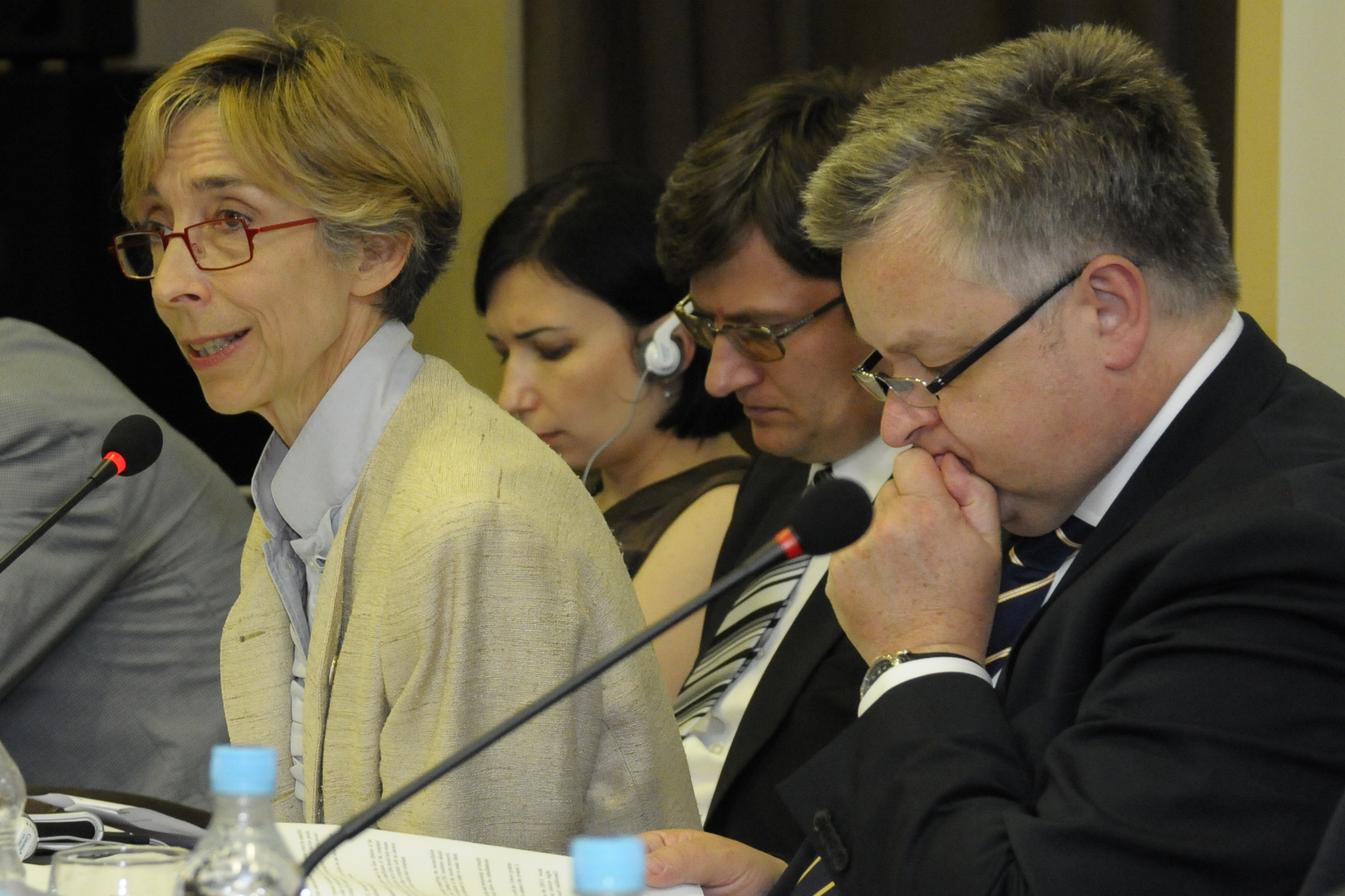 Tana de Zulueta (l), Head of the ODIHR election observation mission for the 25 May early presidential elections in Ukraine, and Michael Georg Link (r), Director of ODIHR, taking part in the discussion of follow-up to the report at the roundtable event in Kyiv, 14 July 2014.