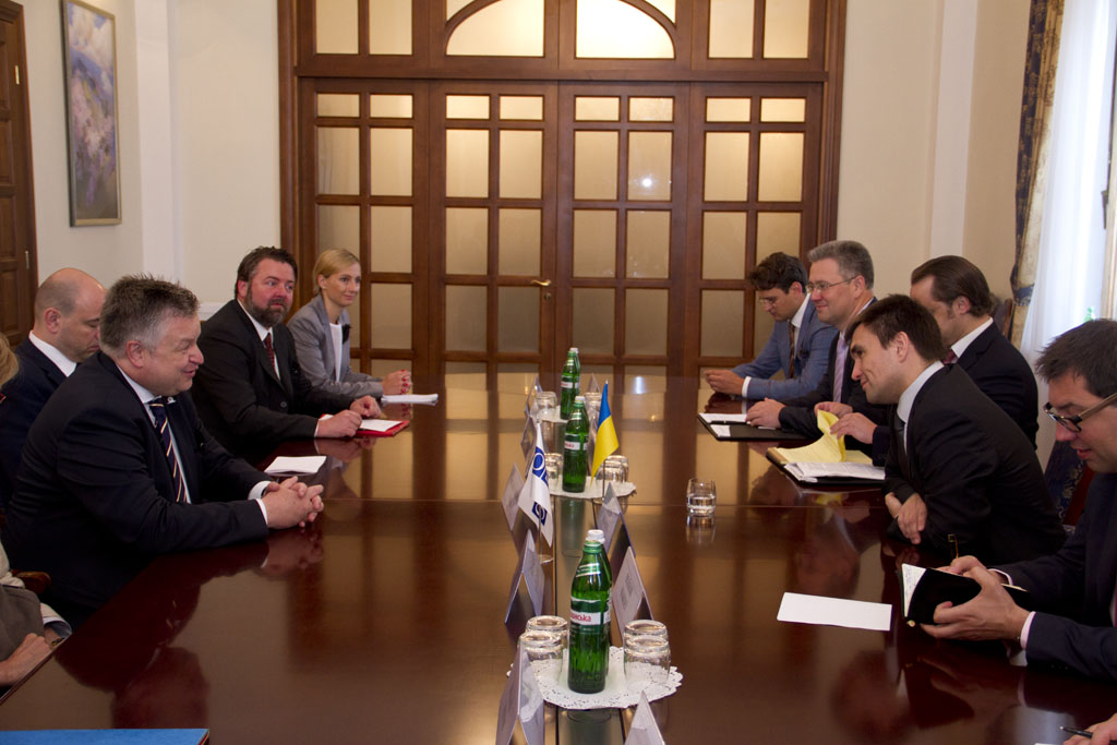 Michael Georg Link (l), Director of the OSCE Office for Democratic Institutions and Human Rights (ODIHR), meeting with Ukraine Foreign Minister Pavlo Klimkin (r) in Kyiv, July 14 2014. The two met to discuss the final report by the election observation mission to observe the 25 May early presidential elections and the situation in eastern Ukraine, including the situation of Roma there.