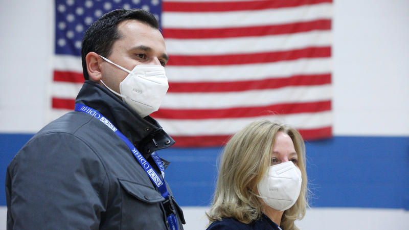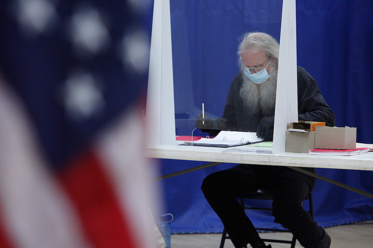 An election worker cross-checks a voter list at a polling station in Concord, NH, on election day, 3 November 2020