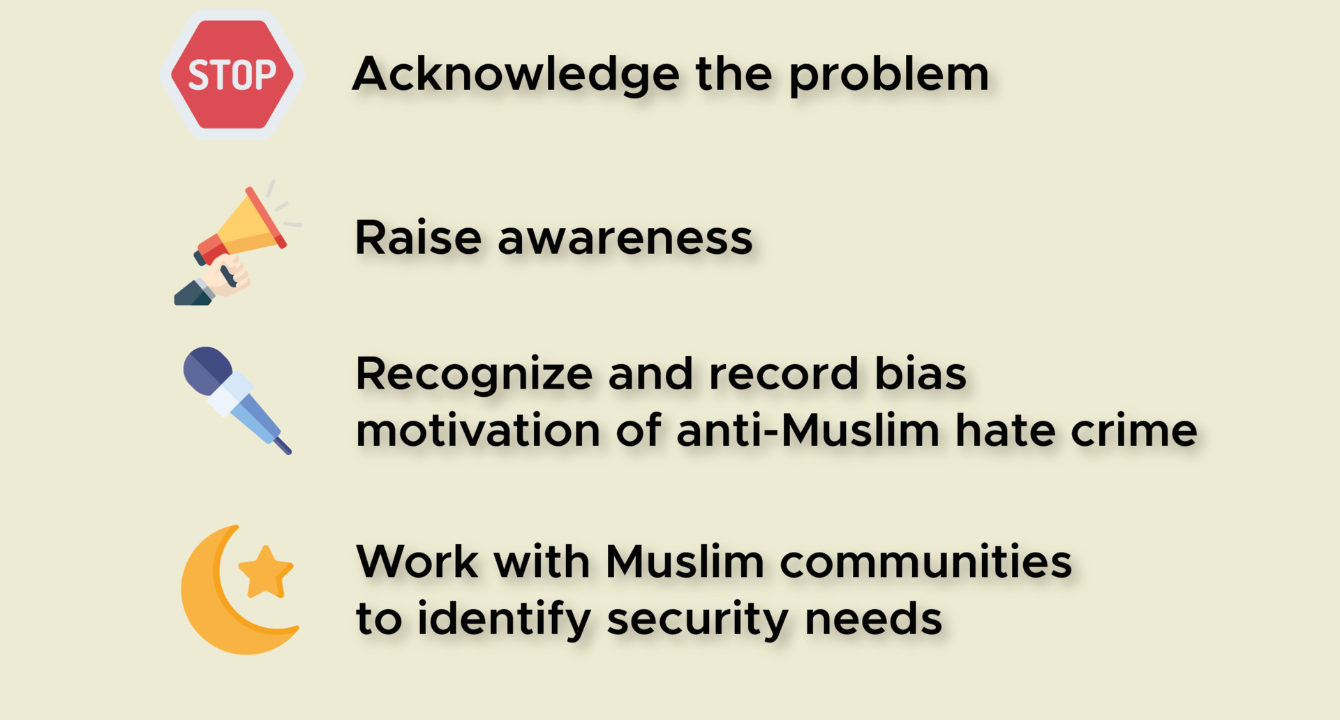 Understanding the challenge of hate crime against Muslims is the first step towards finding solutions. The practical steps shown in this infographic aim to help governments and everyone working to combat Anti-Muslim hate crime turn policies into action and build tolerant societies for the benefit of us all.