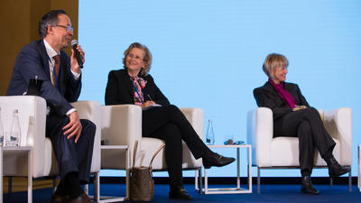 Participants in the high-level panel of ODIHR's 30 anniversary conference (left to right): OSCE High Commissioner on National Minorities Kairat Abdrakhmanov, President of the OSCE Parliamentary Assembly Margareta Cederfelt and OSCE Secretary General Helga Maria Schmid. Warsaw, 14 October 2021.