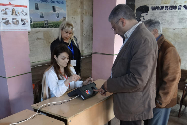 A voter in Yerevan having his fingerprint scanned to confirm his identity before receiving his ballot for the parliamentary elections in Armenia, 2 April 2017.