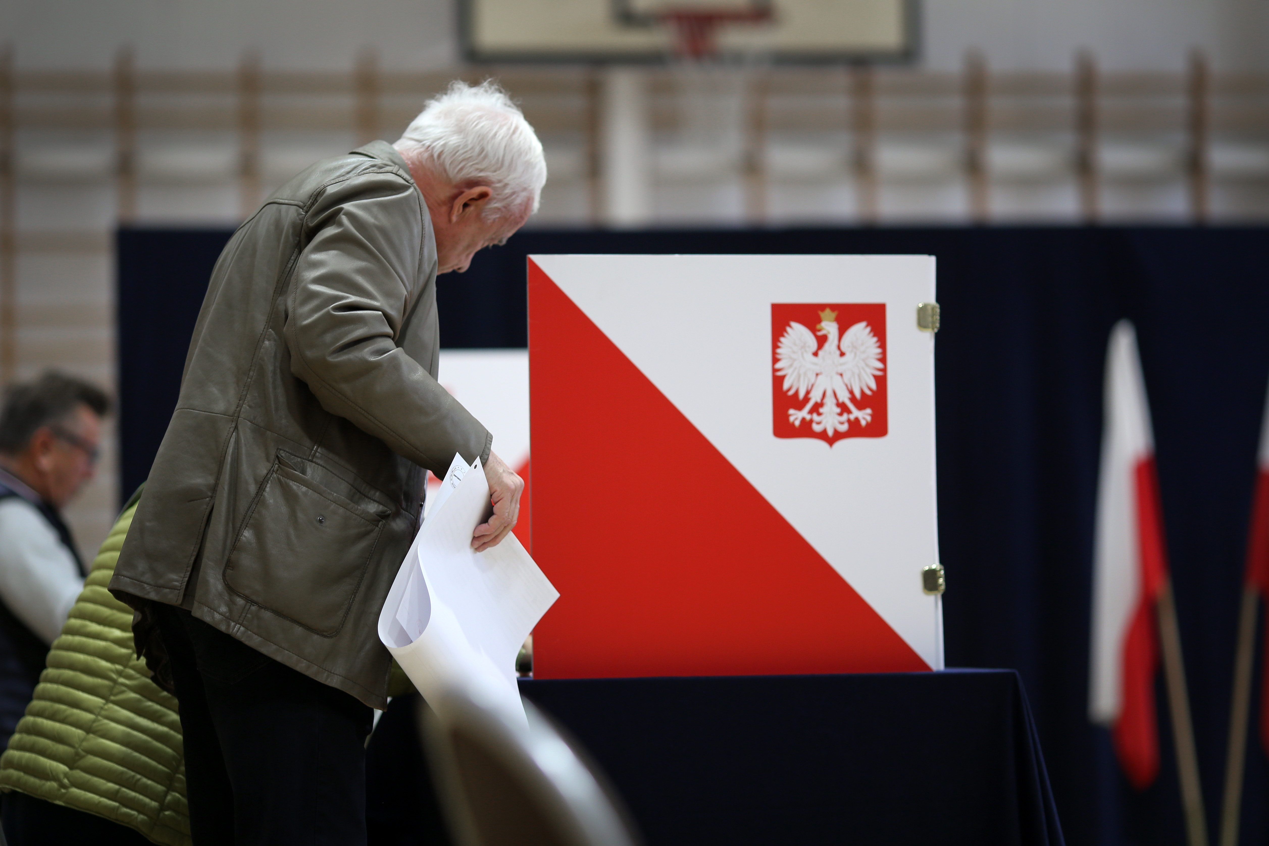 Wyborca przygotowuje się do oddania głosu w wyborach parlamentarnych w Polsce. Słomczyn, 15 października 2023 r.