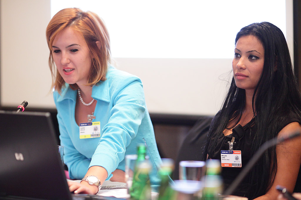 Kadri Kruja (left), a social worker at the municipality of Elbasan in central Abania and Manuela Lake, a Senior Peer Educator at the Elbasan Youth Centre, spoke about a OSCE/ODIHR-funded project which is helping to improve the local Roma and Egyptian community’s access to education, healthcare, civil registration and employment during a side event on preventing child trafficking held at the OSCE Human Dimension Implementation Meeting in Warsaw, 6 October 2011.