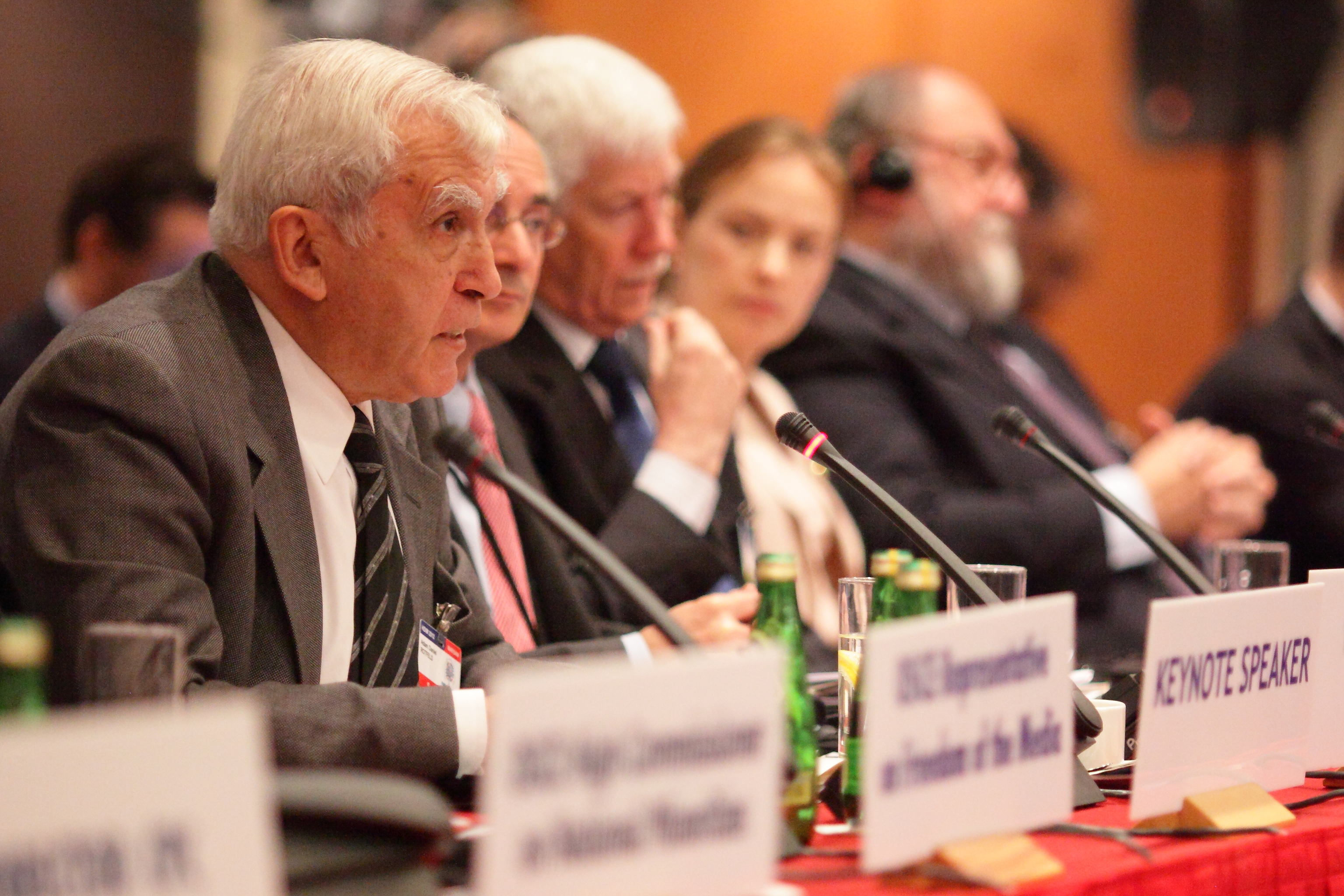 (L-r) Adam Rotfeld, the former Foreign Minister of Poland, addresses the Opening Plenary of the OSCE Human Dimension Implementation Meeting, as Douglas Wake, the First Deputy Director of OSCE/ODIHR, and Frank Cogan, the Head of the Irish OSCE Chairmanship Taskforce, listen. Warsaw, 24 September 2012.