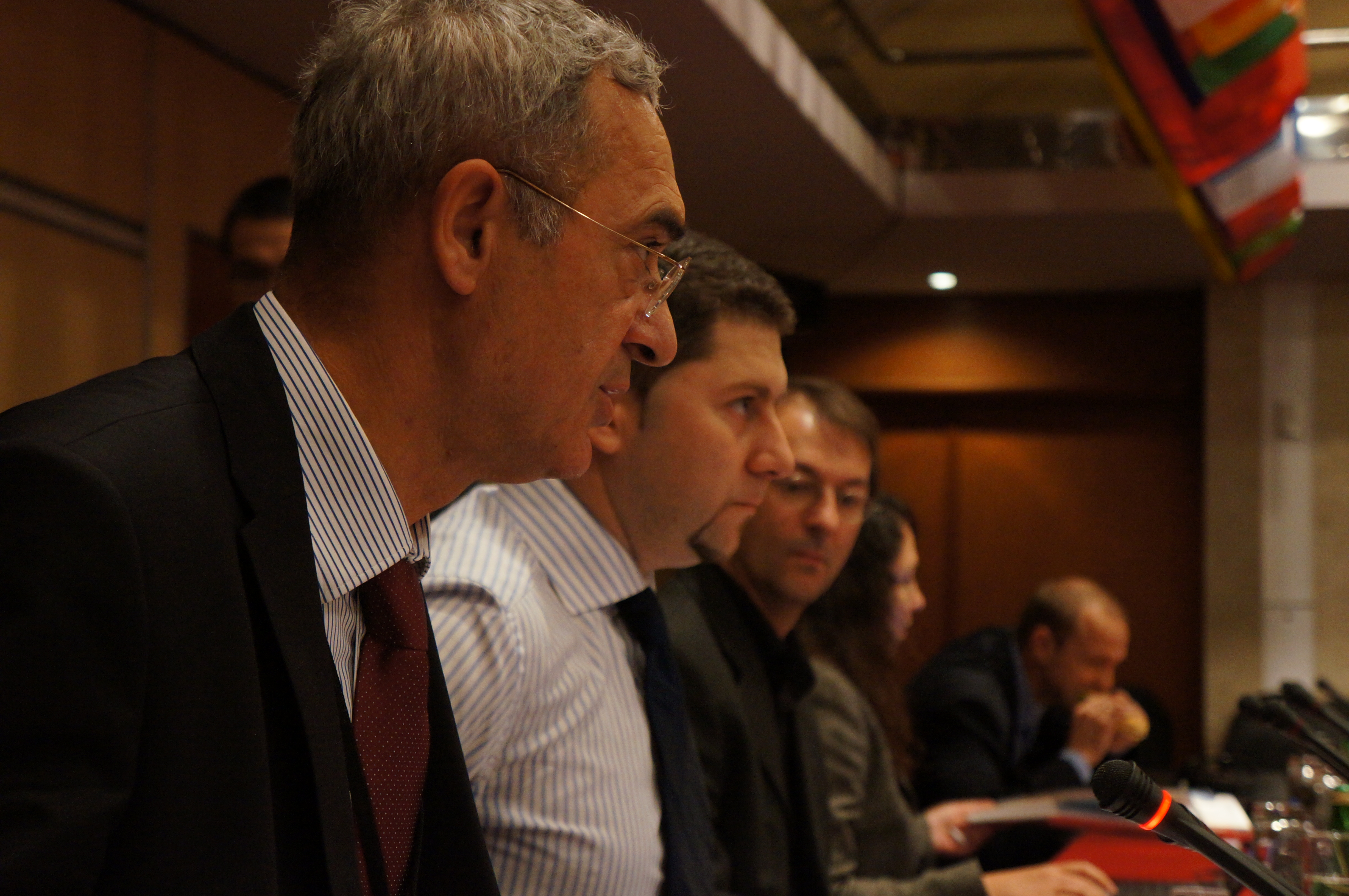 Andrzej Mirga (l), the ODIHR Senior Adviser on Roma and Sinti Issues addresses an event during the Human Dimension Implementation Meeting on countering racism and violence against Roma as Dezideriu Gergely (c), Executive Director at the European Roma Rights Centre, listens, Warsaw, 27 September 2012.