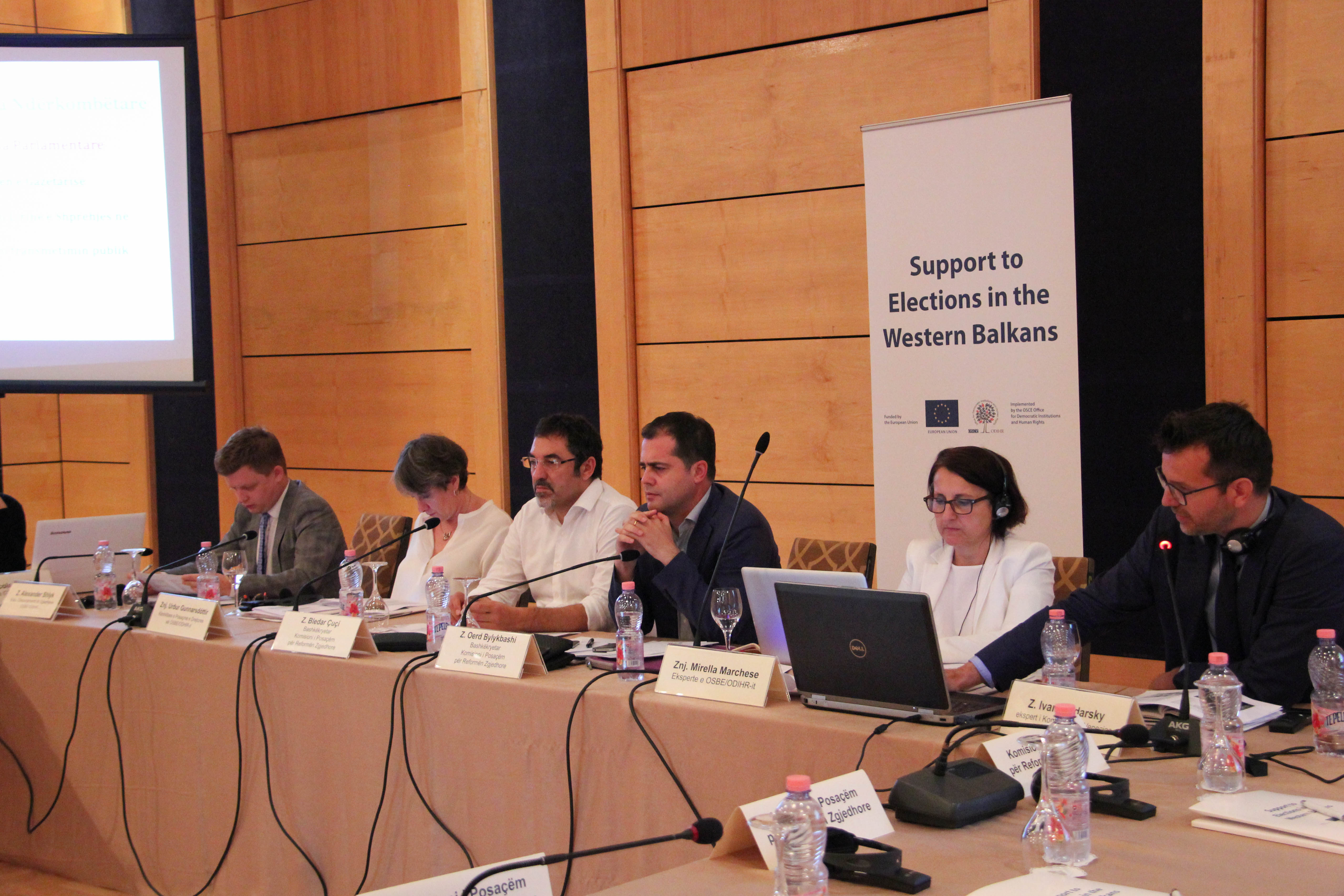 Pjesëmarrësit në një tryezë teknike për punën e medias gjatë fushatave zgjedhore, mbështetur nga Zyra e OSBE-së për Institucione Demokratike dhe të Drejtat e Njeriut (ODIHR) dhe Prezencës së OSBE-së në Shqipëri, 4 korrik 2018, Tiranë.