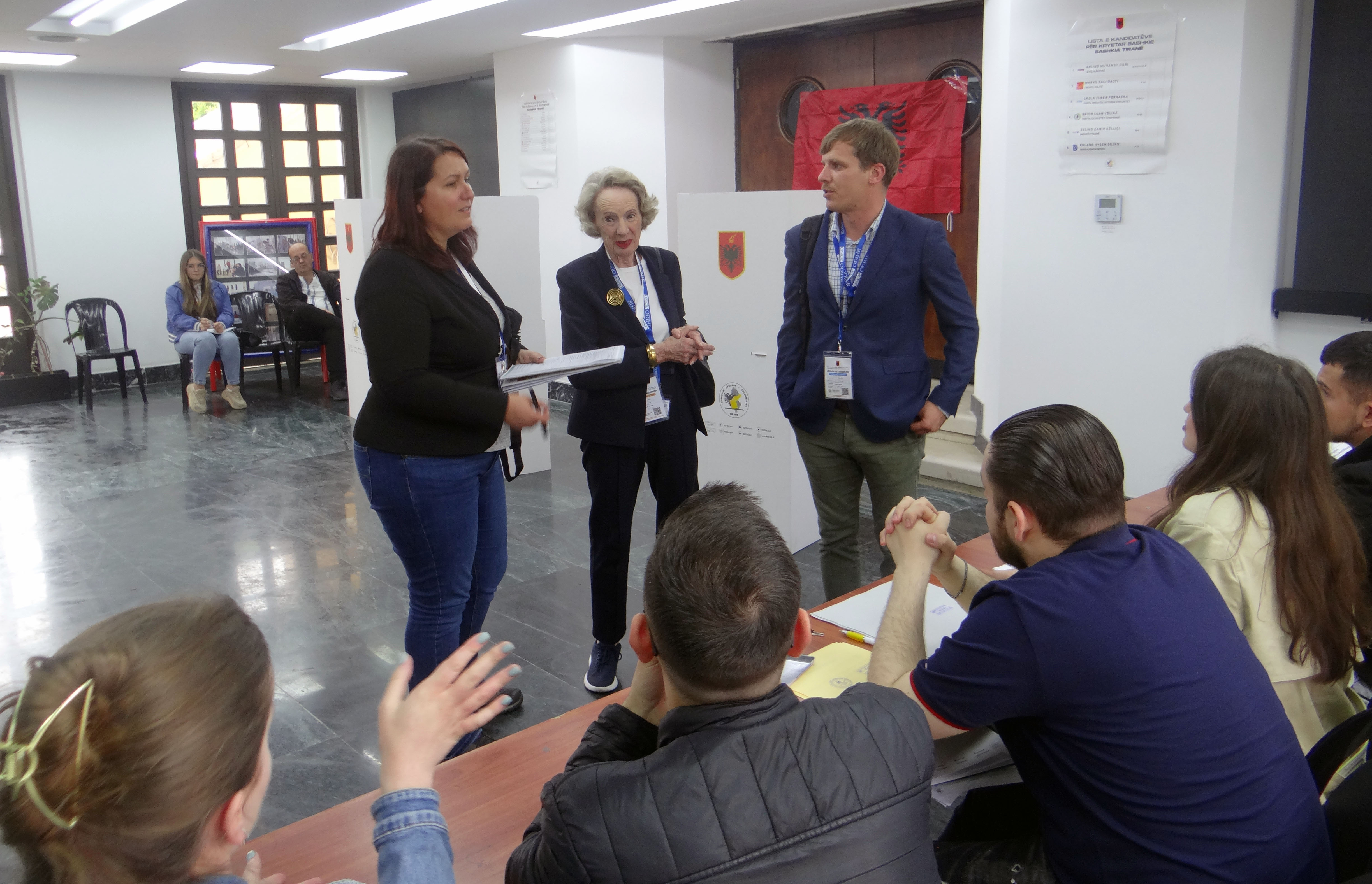 Ambassador Audrey Glover (c), Head of the ODIHR election observation mission for Albania's local elections, speaking with members of a polling station commission in Tirana, 14 May 2023.